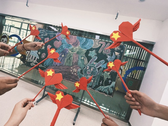 一只只红色的“爱国心箭”手工制品被患者们高高举起,背景黑板上的国庆主题涂鸦色彩斑斓、创意十足。这些带着翅膀与五角星的手作,是患者们在国庆期间,用创意与匠心雕琢的康复印记,每一支“心箭”都承载着他们对祖国的热爱、对康复的信念,更饱含着对祖国的深深祝福。