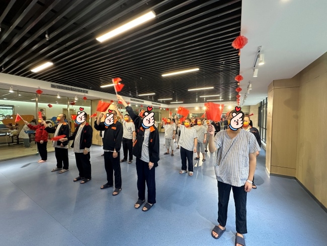 活动现场,患者们手持鲜艳的小红旗,在宽敞明亮的活动大厅中列队,伴随着激昂的音乐,共同挥舞红旗,齐唱爱国歌曲。他们脸上洋溢着真挚的笑容,眼神中充满了对祖国的热爱与祝福。这一环节不仅点燃了大家的爱国热情,更让患者在集体活动中感受到了归属感与凝聚力。