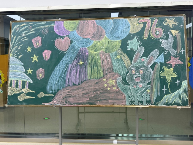 在创意绘画区,患者与康复团队携手打造国庆主题黑板报。有人负责勾勒“阅兵兔”的可爱轮廓,有人为气球晕染出梦幻的渐变色,还有人细致描绘出天安门的飞檐翘角……原本空白的黑板,在众人的巧手下变成了一幅充满童趣与力量的爱国画卷:绚烂的烟花绽放天际,和平鸽驮着星光飞翔,“76”的数字在画面中格外醒目,诉说着祖国76年的辉煌征程。